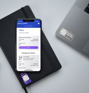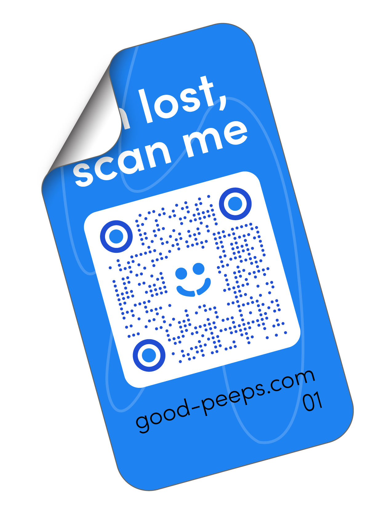 A Good Peeps pack contains 20 unique QR code stickers in different sizes and 7 hang tags. You can put your stickers on your stuff and manage the sticker settings from your Good Peeps dashboard.